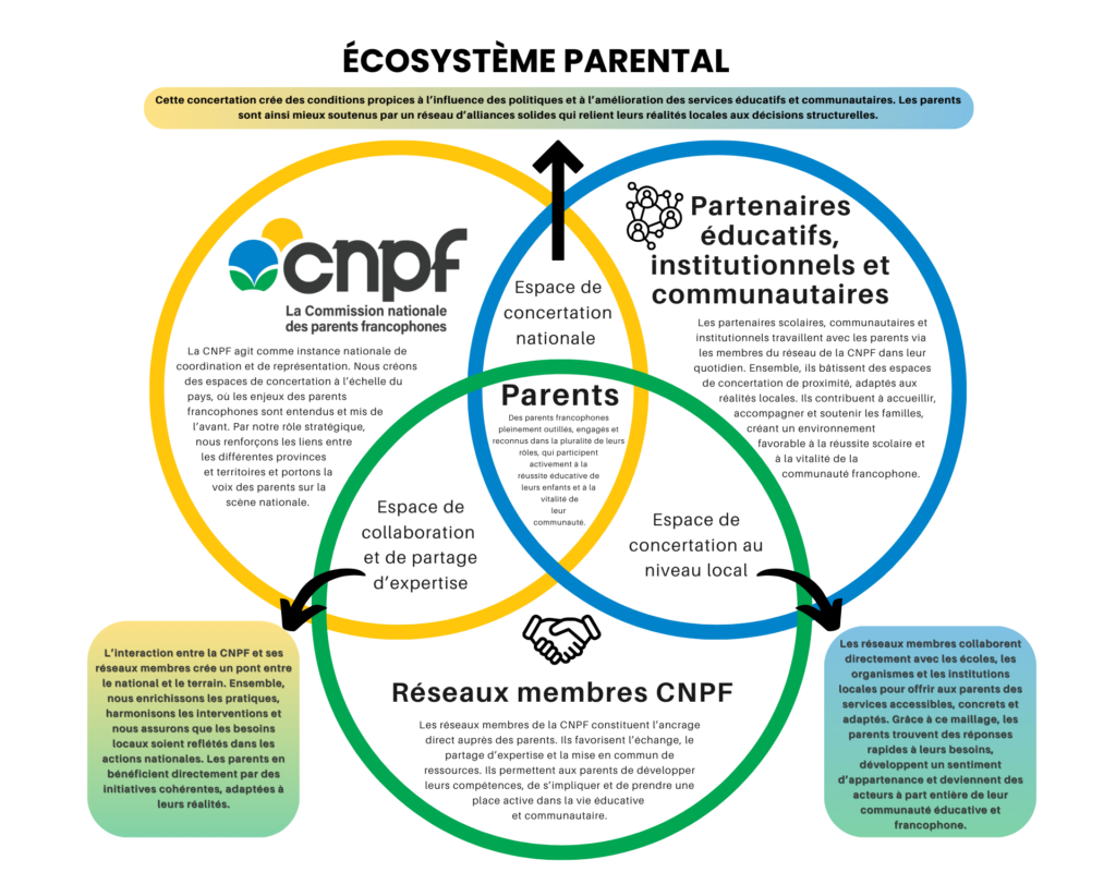 D’ici 2030, la CNPF vise l’émergence d’un écosystème parental francophone fort, solidaire et inclusif à l’échelle du pays. Un écosystème dans lequel chaque parent est reconnu, valorisé et accompagné comme premier éducateur, premier responsable de ses enfants et acteur clé de la vitalité linguistique, culturelle et communautaire.